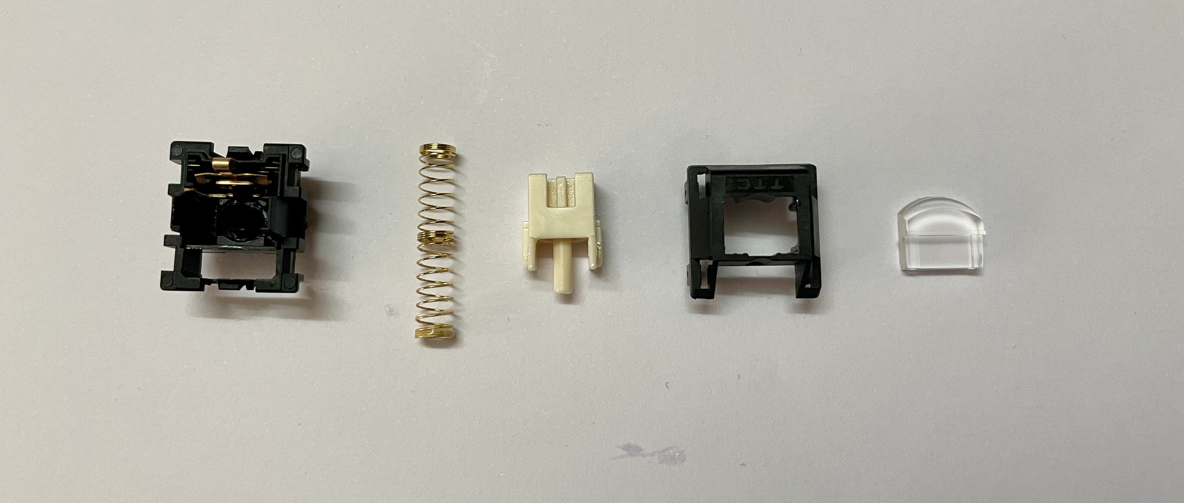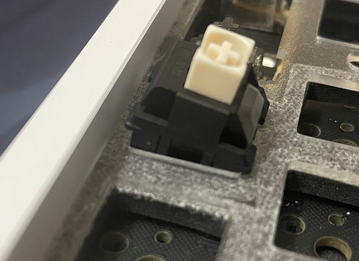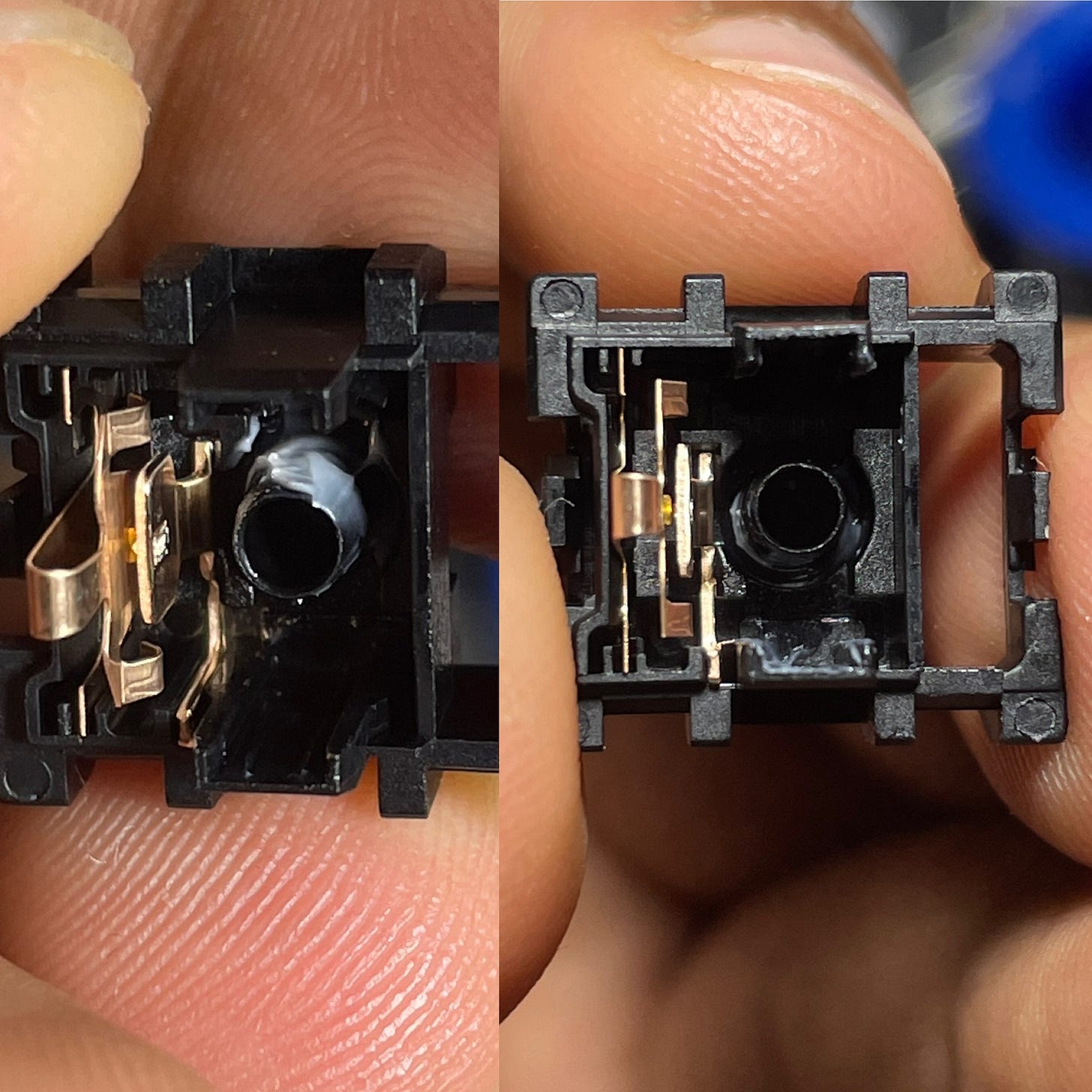 Since, I was unhappy with the inconsistent feel and sound of the stock switches, I decided to lube and film them. I used Tribosys 3204 for the bottom sliders, and stems. I also bag lubed the springs with Krytox GPL 105. Filming these switches presented a challenge as the light guiding components come in the way of the films.