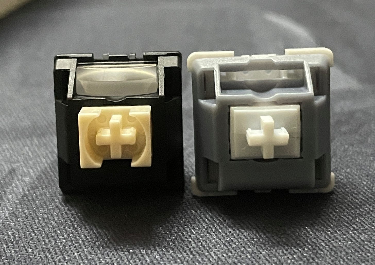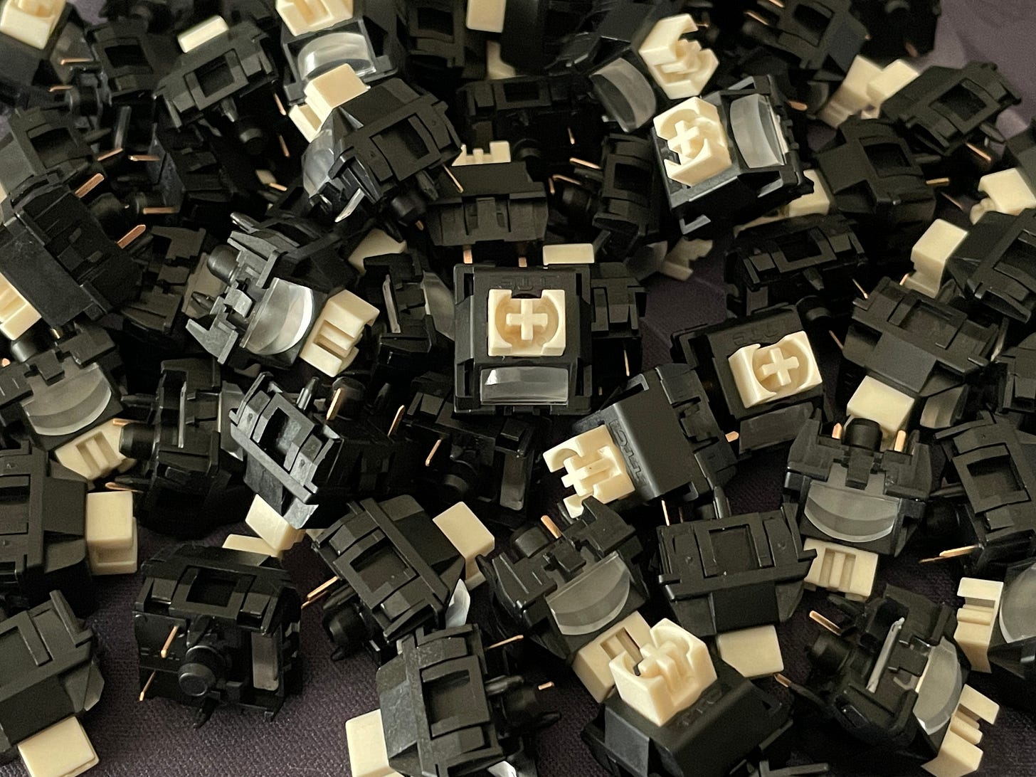 The Hey Linears are PCB mount (5-pin) switches manufactured by TTC consisting of Cream colored Box shaped POM stems, Black Nylon top & bottom housings, and 18.5mm 2-stage 58g gold plated springs. The stems being boxy, reduces the stem wobble to minimal levels and the housing is what I would call of medium tightness, allowing the usage of films. The metal pins were very strong and it is one of the very few switches that I’ve received without any bent pins.
