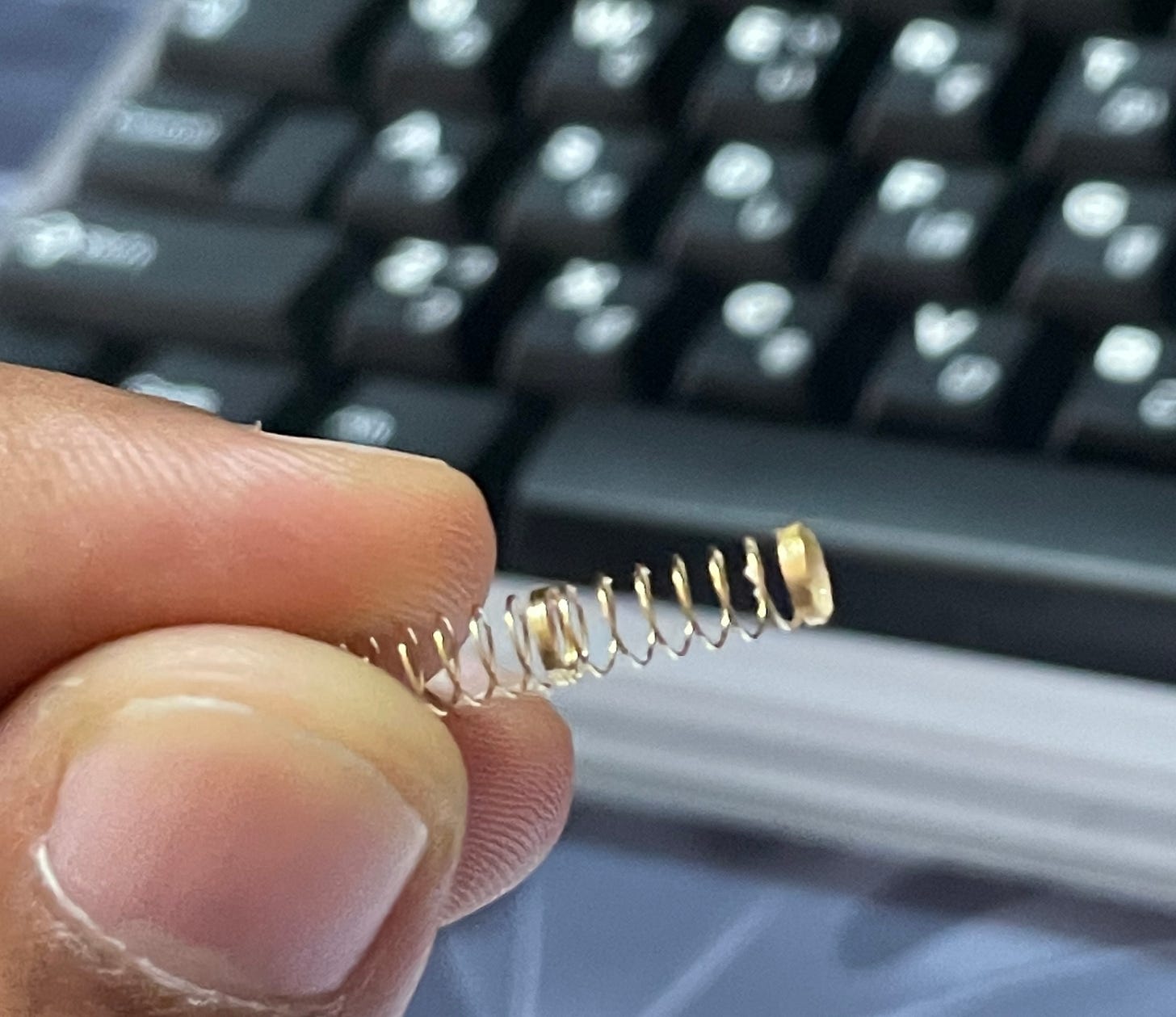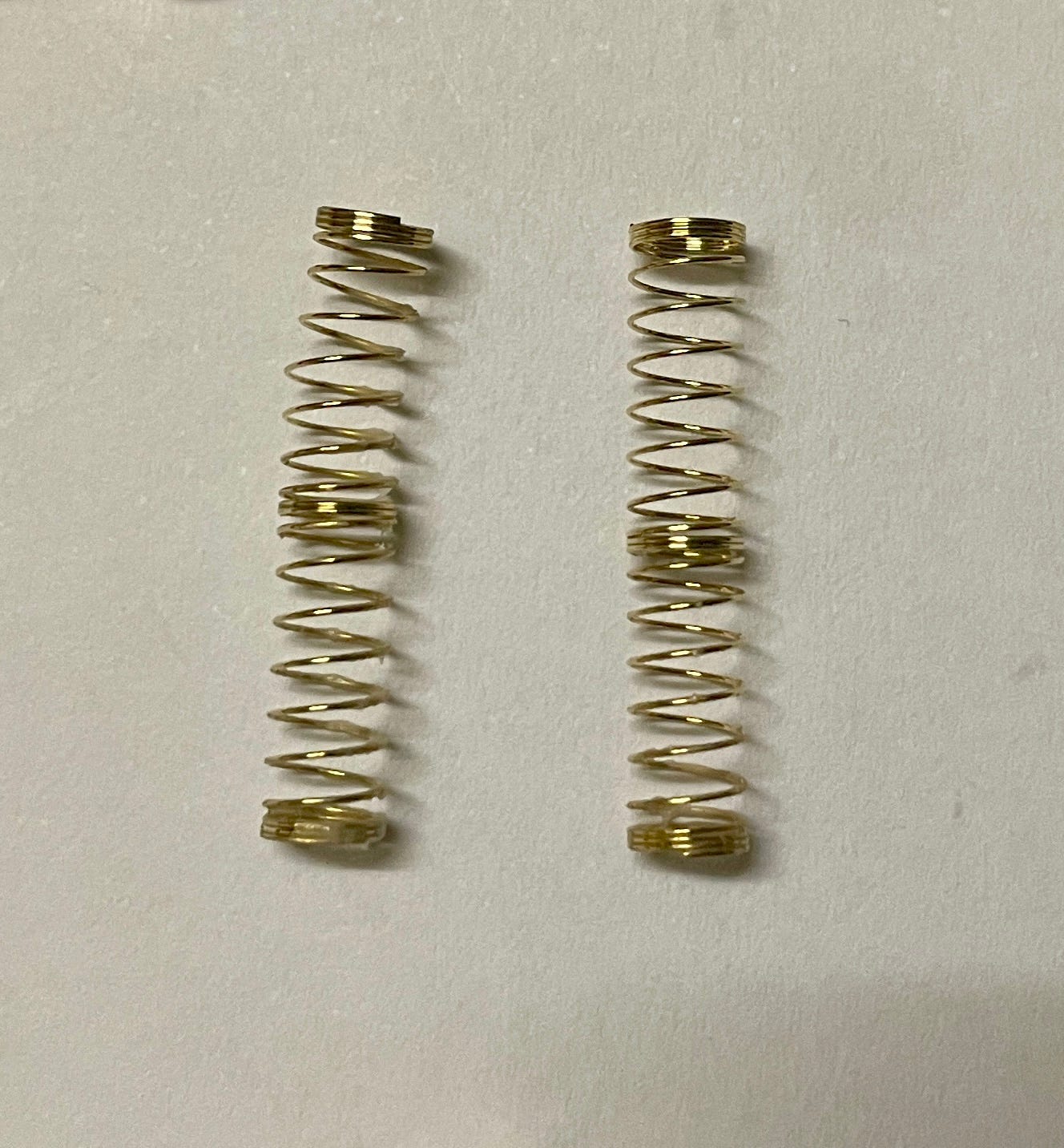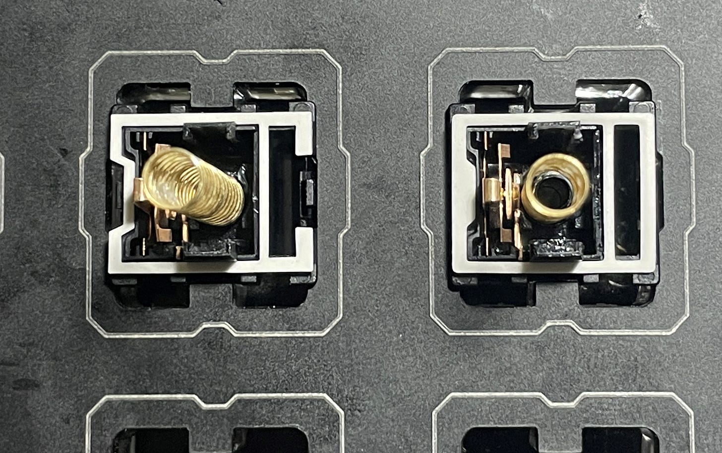 These springs are essentially two springs attached vertically, thereby increasing their lengths. The increased length means the spring sits preloaded in the switch and offers a slower force curve. Sadly, some springs (10%) in my batch of 70 were bent and created some problems while closing the switch post lubing.